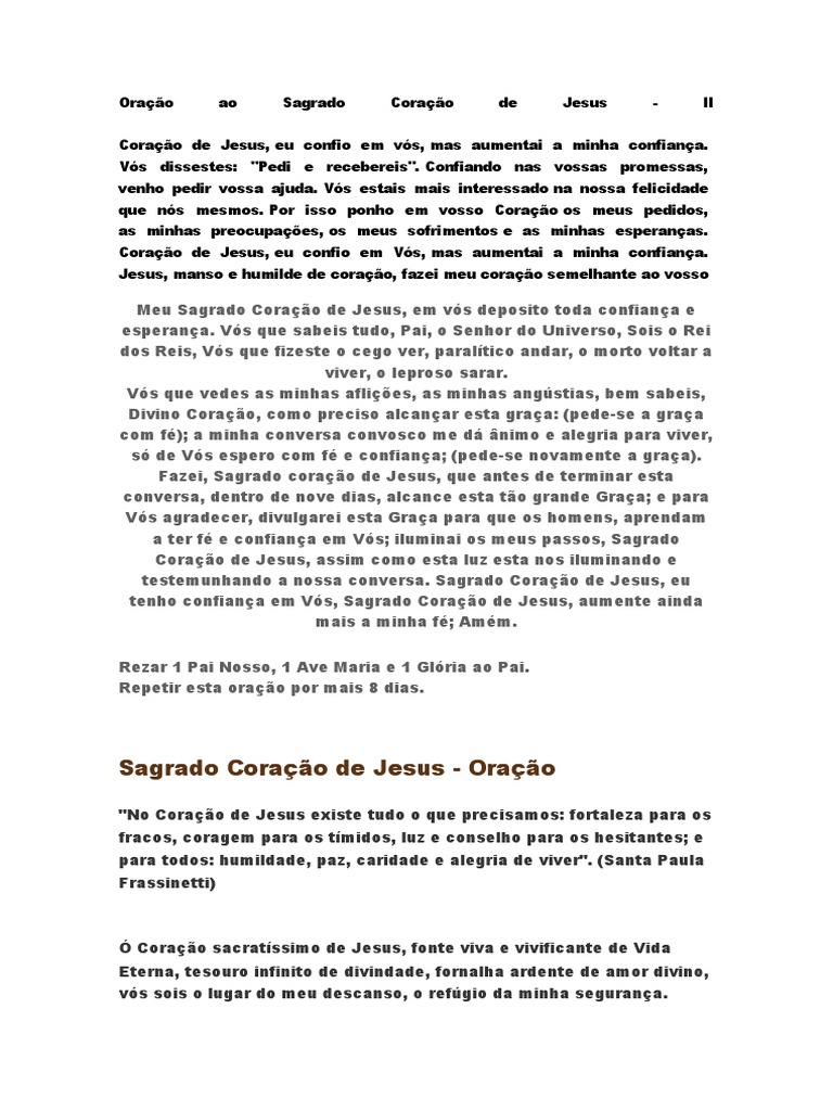 Os meus pensamentos sejam os vossos pensamentos. O sagrado coração de jesus está presente em muitas dioceses, paróquias, comunidades e famílias com alguma imagem ou mesmo quadros. Margarida maria alacoque, foi a mulher a quem jesus mostrou o seu coração em sua essência e entregou a mensagem do seu amor infinito por toda humanidade. As minhas palavras sejam as vossas palavras; Vós que vedes as minhas aflições, as minhas angústias, bem sabeis. Sagrado coração de jesus, tenho total confiança em vós, e a cada dia que passa aumenta minha fé e meu amor. A oração do sagrado coração de jesus é uma das mais belas de nossa santa igreja. Vós que sabeis tudo, pai, o senhor do universo, sois o rei dos reis fazei, sagrado coração de jesus, que antes de terminar esta conversa, dentro de nove dias, alcance esta tão grande graça; A devoção ao sagrado coração de jesus com são joão evangelista ao pé da cruz, quando um soldado romano com uma lança atravessou o lado de jesus. Iluminai meus passos, sagrado coração de jesus, assim como esta vela está iluminando e testemunhando a nossa conversa. Que todos os movimentos e palpitações do meu coração, mesmo durante o sono, vos sejam um testemunho do meu amor e vos digam sem cessar: Você experimentou perda quando seu amigo lázaro morreu e traição quando seus amigos o abandonaram e o rejeitaram nas horas mais sombrias. Meu sagrado coração de jesus, corro e venho a vós, porque sois o meu único refúgio, o meu único consolo, a minha única certeza, a minha única e firme esperança.
